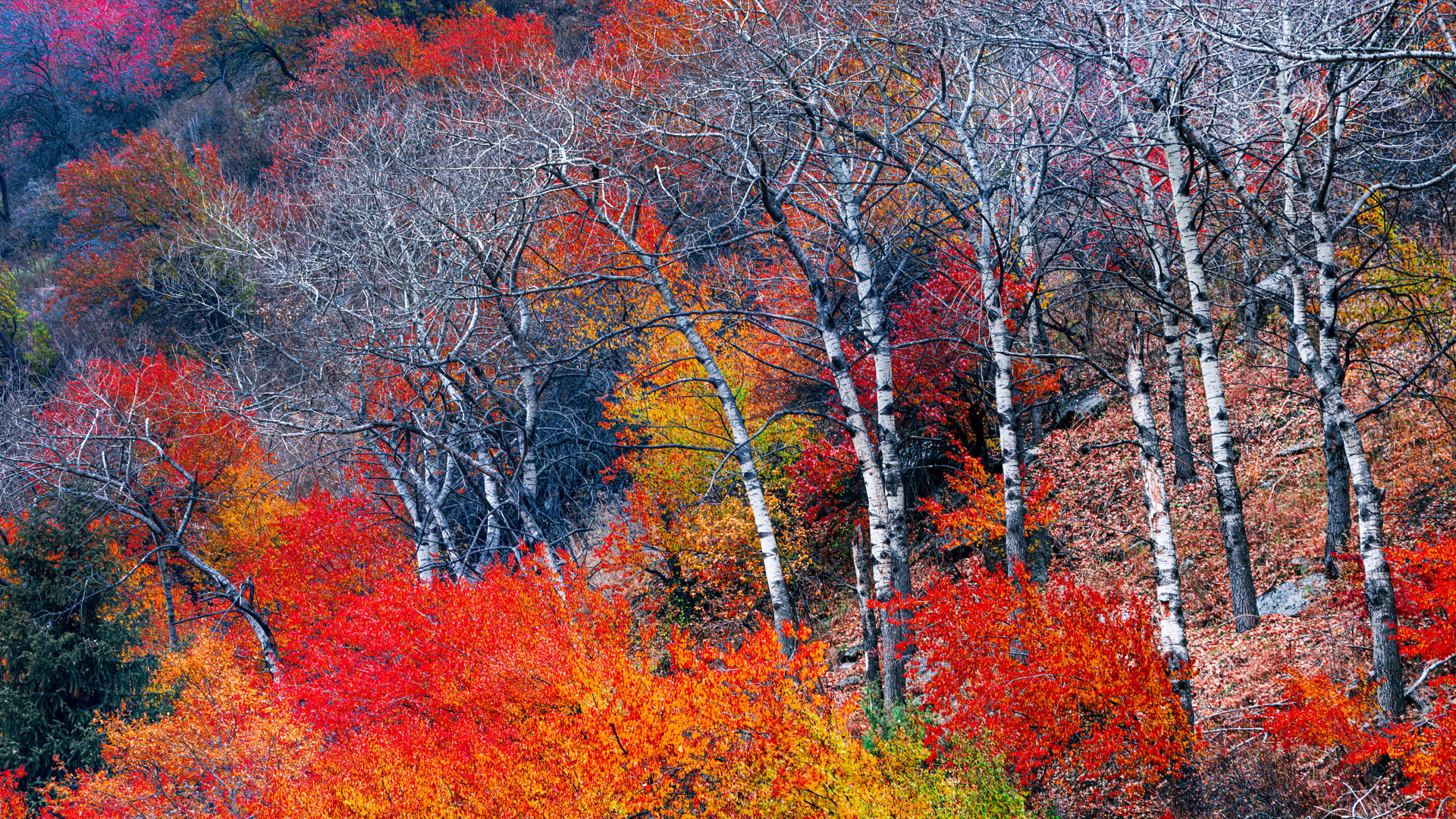 В тихом горном уголке города, где осень особенно чувствуется. Холодный синий свет проходит между стройными берёзами, а жёлтые листья появляются как тёплые вспышки среди прохладной палитры.